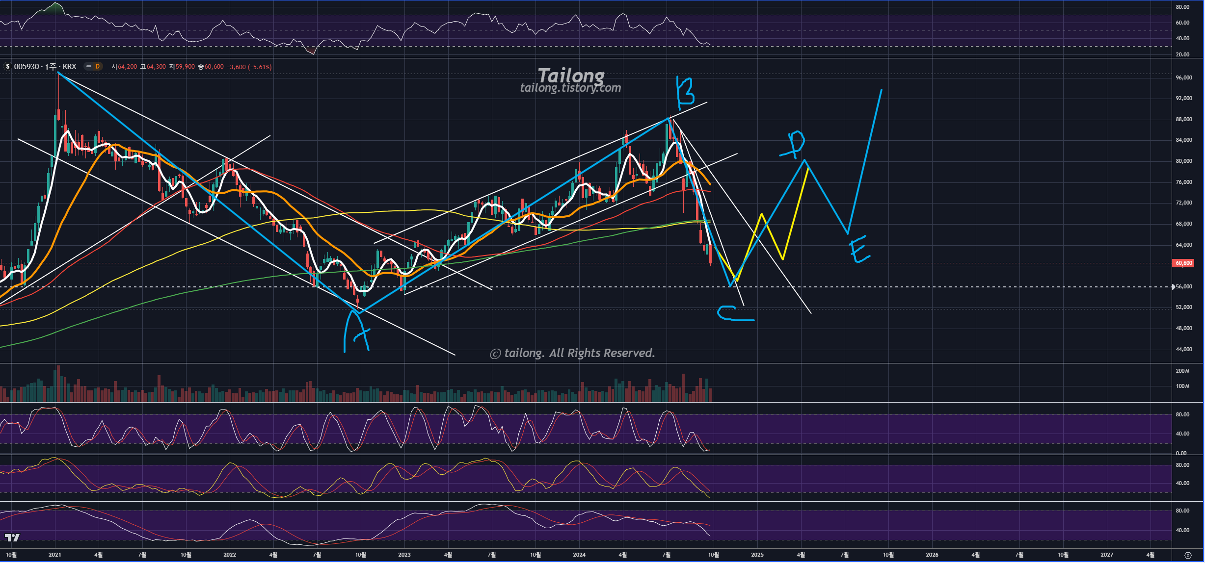 위 차트는 삼성전자 주봉 차트입니다. 노란 동그라미 위치가 이전 24년 1월 게시글 업로드 시기네요.
