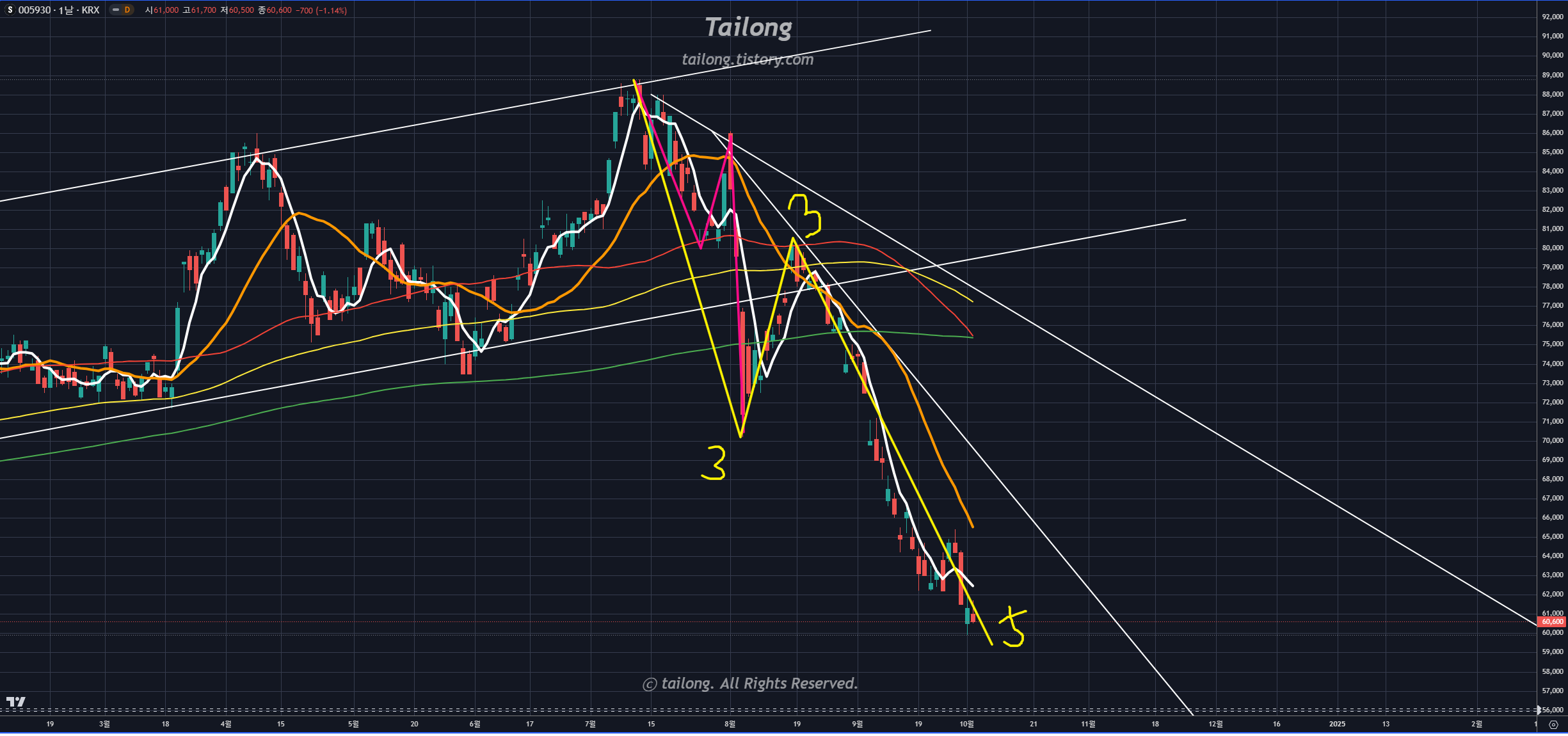 위 차트는 삼성전자 주봉 차트입니다. 24.10.06에 올린 이후 삼성전자는 여전히 하락 중에 있습니다.