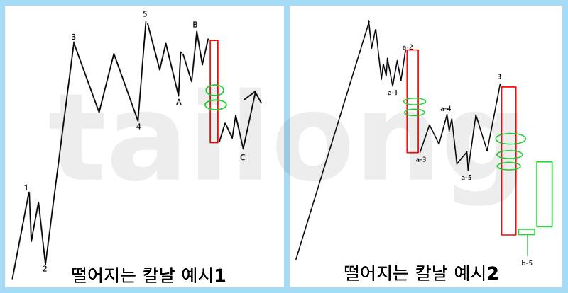 적당한 낙폭으로 하락하는 것을 떨어지는 칼날이라고 하진 않으며, 4시간 봉이나 일봉상에서 확연히 보일 정도의 '급락'이 진행되는 경우를 떨어지는 칼날이라고 부를 수 있다고 생각하며 이런 자리는 보통 엘리어트 파동이론의 충격파동 3파 혹은 그 이후에 해당하는 경우가 많습니다.
