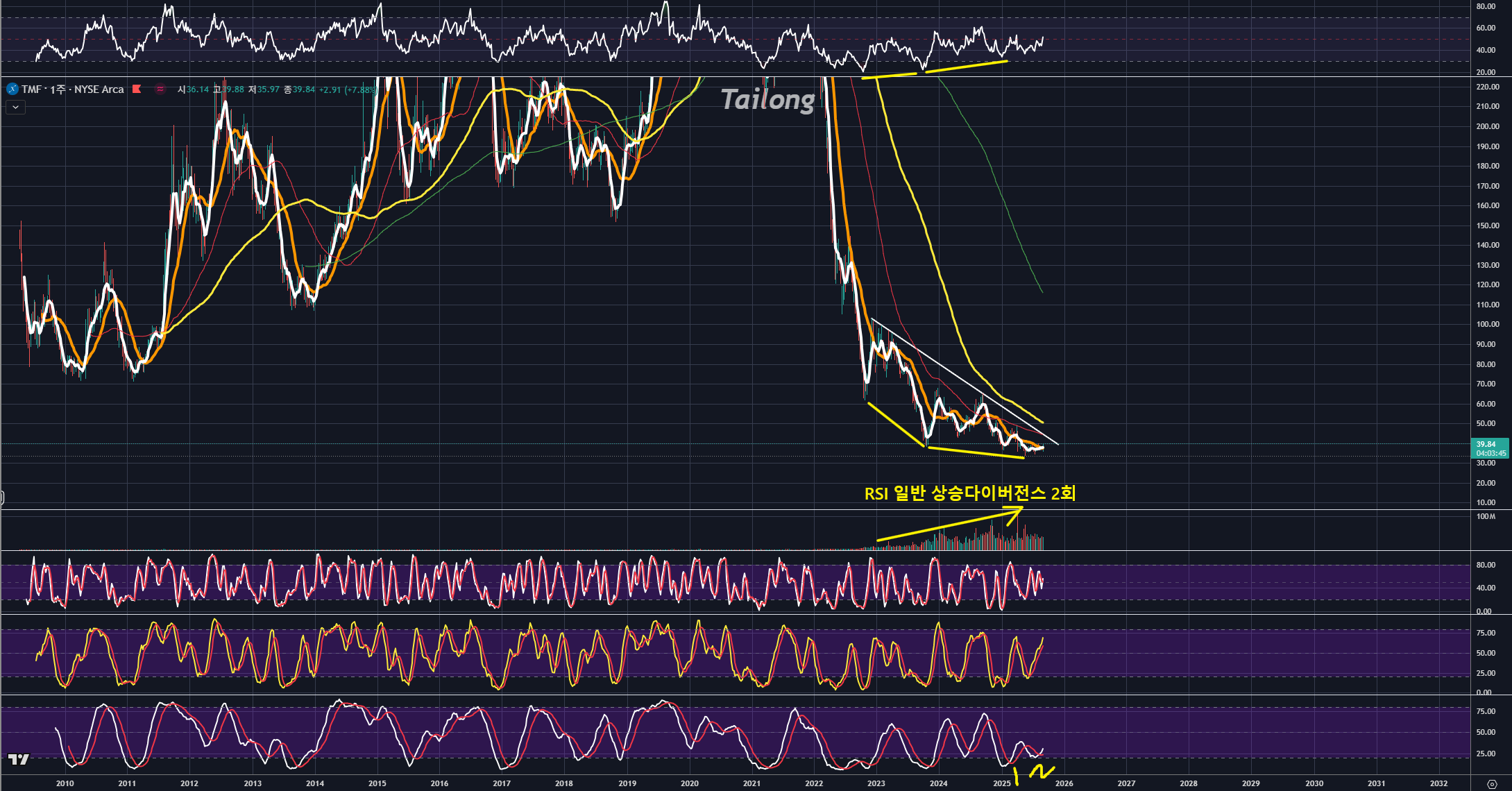 위 차트는 미국 국채 3배 레버리지인 TMF 주봉 차트입니다. 주봉상 RSI 일반 상승다이버전스를 2회 연속 만들며 저점을 횡보 중입니다. 저점 횡보 중 거래량이 점진적으로 우상향하는 모습이 보입니다. TLT 월봉 차트의 거래량 또한 점진적으로 거래량이 늘어나고, TMF의 거래량 또한 증가하는 것을 보면 미국 금리 인하 전에 '매집'하고 있는 것이 아닌가 싶습니다. TMF는 TLT와는 다르게 1회 더 저점을 갱신하였습니다.