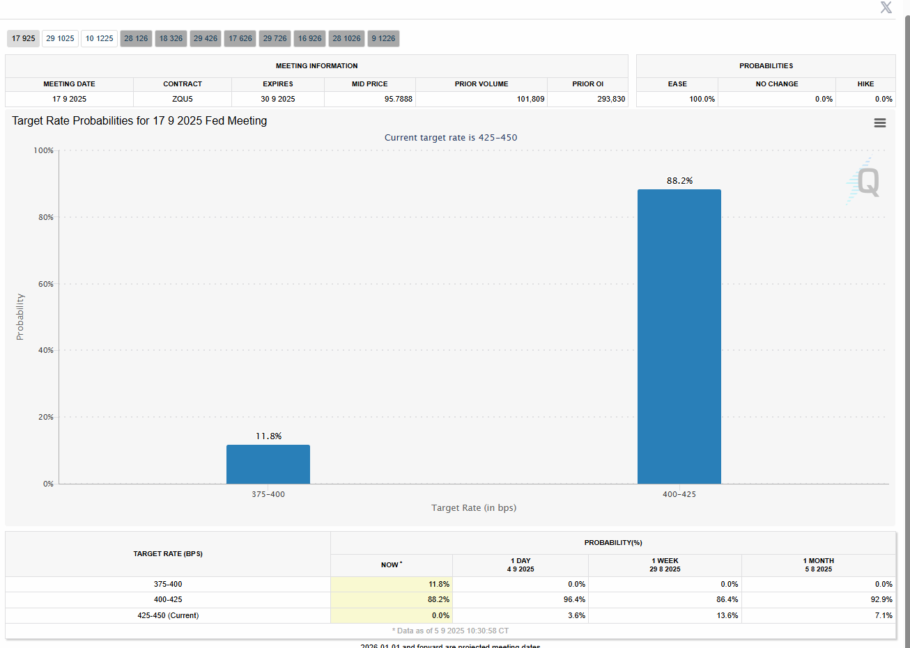 현재 금리가 4.50이니, 9월 17일 금리 발표는 25BP 인하가 88.2%이고 50BP 인하가 11.8%로 금리인하는 확정적이라고 볼 수 있습니다.
