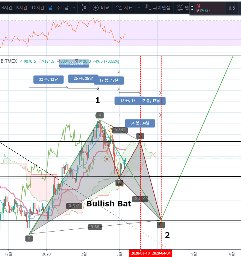 2파의 ABC 조정이 나온다면 Bullish Bat Pattern이 나오면서 하모닉패턴도 만들어질 것 같습니다.
